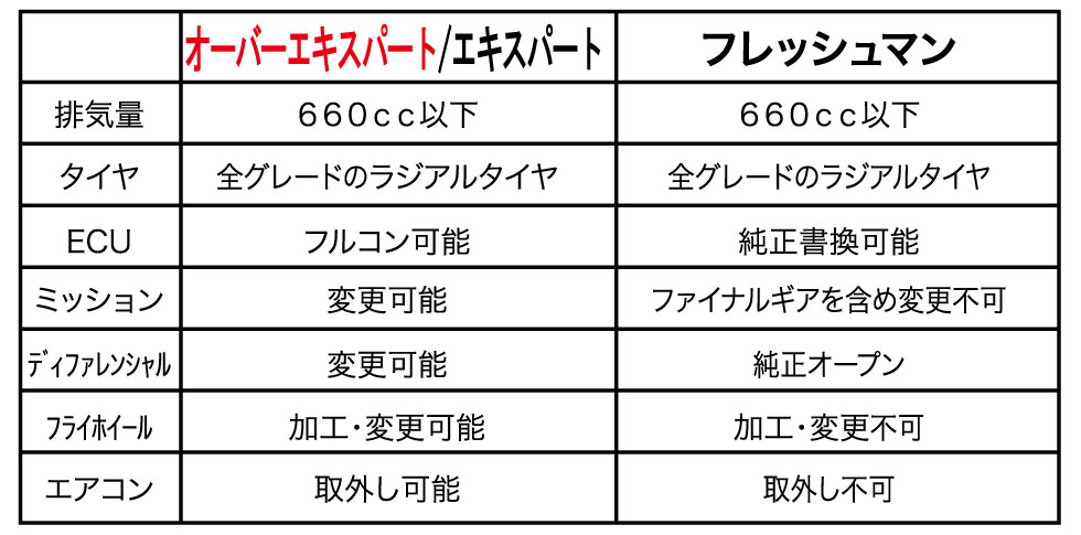 オーバーエキスパート&エキスパート:ボンネットとリヤゲート、後部ドアなどに軽量部品を使用できる。ただし後部ドアを交換する場合は十分な強度を確保して取り付けも確実な製品であると同時に、ナンバー付き車両は2名乗車で公認車検を受けるか、ナンバーを抹消した状態でなければならない。フレッシュマン:ボンネットやリヤゲートなど軽量部品を使用できるが、ドアをFRP製などに交換することは認められない。